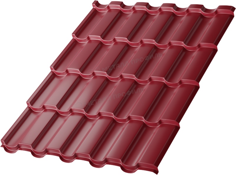 Металлочерепица с профилем Монтекристо-ML толщиной 0,45 мм и покрытием VikingMP® в оттенке RAL 3005 Красное вино представляет собой надежный кровельный материал от компании Металл-Профиль. Этот продукт сочетает эстетику классической черепицы с прочностью металла, обеспечивая долговечность и привлекательный внешний вид для крыш жилых и коммерческих зданий.