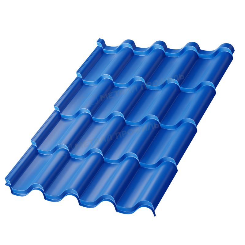 Металлочерепица Монтерроса-XL с покрытием PURMAN® в насыщенном синем цвете RAL 5005 представляет собой надежный кровельный материал от компании Металл-Профиль. Толщиной 0,5 мм, она сочетает эстетику классической черепицы с прочностью металла, обеспечивая долговечность и стиль для вашего дома.