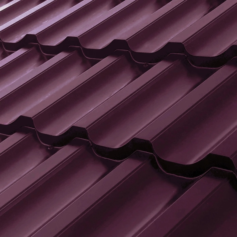 Одним из ключевых преимуществ является сочетание доступной цены и высокого качества: металлочерепица служит до 50 лет без потери свойств. Она легка в установке, не требует сложного ухода и снижает нагрузку на стропильную систему благодаря малому весу (около 5 кг/м²). Цвет RAL 3005 добавляет элегантности, повышая рыночную стоимость объекта. Кроме того, материал экологичен, подлежит переработке и не выделяет вредных веществ.