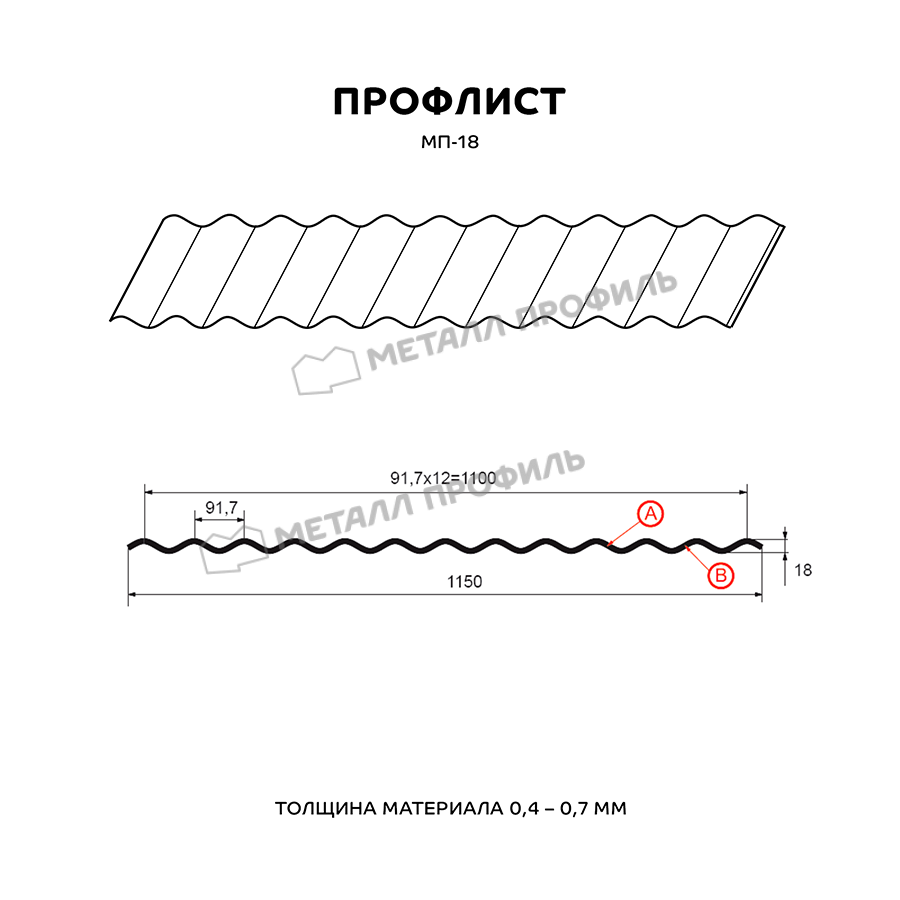 Профиль МП-18 характеризуется трапециевидной формой волны с высотой 18 мм, что придает материалу повышенную жесткость. Ширина листа составляет 1100 мм (полезная – 1060 мм), а длина может варьироваться от 0,5 до 12 метров, позволяя адаптировать его под любые проекты.