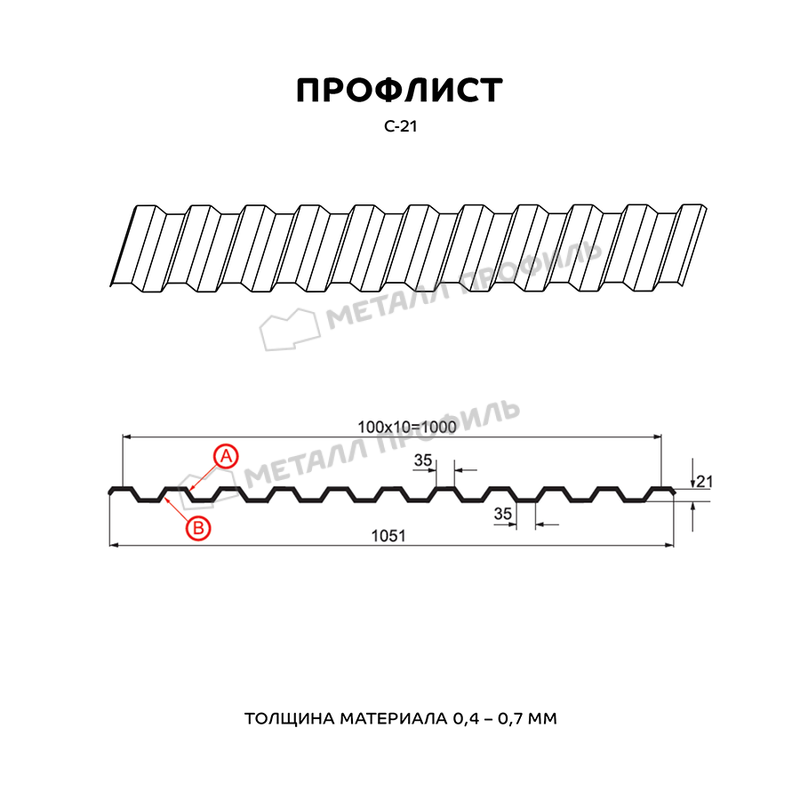 Профиль С-21 характеризуется трапециевидной формой волны высотой 21 мм, что придает материалу повышенную жесткость. Полезная ширина листа — 1000 мм, общая — 1051 мм. Это позволяет использовать его для перекрытий с большими пролетами без дополнительных опор. Сталь толщиной 0.45 мм обеспечивает баланс между весом и прочностью, делая профлист подходящим для заборов, фасадов и крыш. Форма профиля способствует эффективному отводу воды и снега.